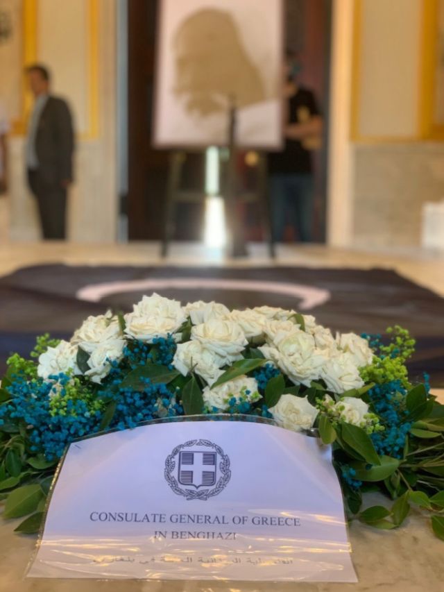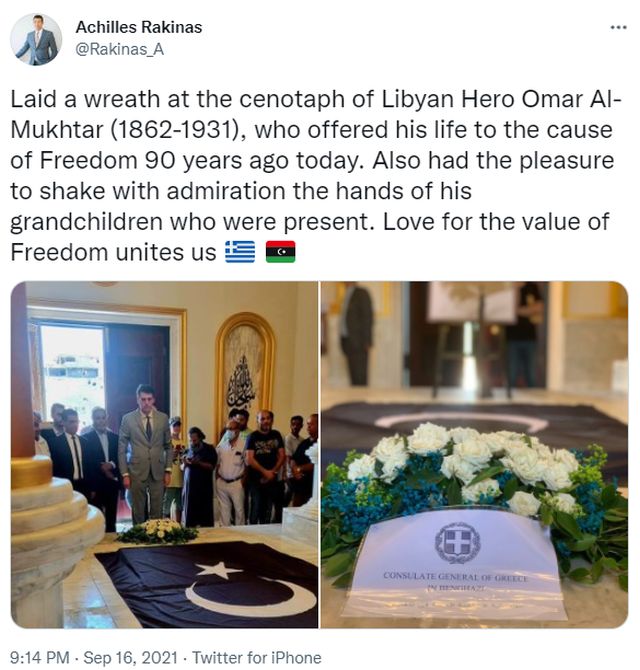 Ο Έλληνας πρόξενος στη Βεγγάζη της Κυρηναϊκής (Ανατολική Λιβύη), Αχιλλέας Ρακίνας, κατέθεσε την Πέμπτη 16 Σεπτεμβρίου άνθη στο μαυσωλείο του εθνικού ήρωα της Λιβύης, του θρυλικού επαναστάτη Ομάρ Αλ Μουχτάρ. Η 16η Σεπτεμβρίου είναι η επέτειος της εκτέλεσης του Λίβυου πατριώτη ηγέτη από τους Ιταλούς αποικιοκράτες.