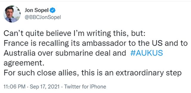 »Η Γαλλία ανακαλεί τον πρεσβευτή της στις ΗΠΑ και στην Αυστραλία λόγω της συμφωνίας υποβρυχίων και της συμφωνίας #AUKUS.
