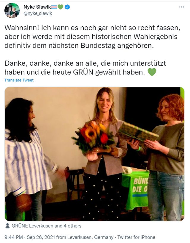 Η 27χρονη Νίκε Σλάβικ (Nyke Slawik), από το Λεβερκούζεν, κατάφερε να μπει στη γερμανική βουλή με τους πράσινους. Και οι δύο τρανς βουλευτίνες είναι πράσινες.