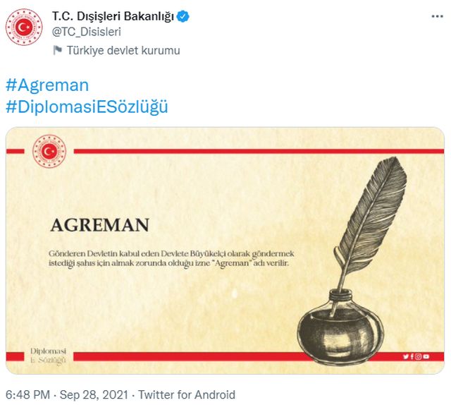 «”Agreman” η συμφωνία ενός κράτους να δέχεται μέλη μια διπλωματικής αποστολής από μια ξένη χώρα» υπονοώντας ότι η ίδια θα αποφασίσει αν θα είναι πρέσβης στην Τουρκία.