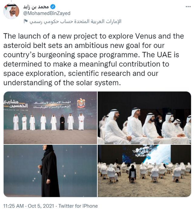 «Σήμερα, τα ΗΑΕ ξεκίνησαν (…) μια νέα διαστημική αποστολή για την εξερεύνηση του πλανήτη Αφροδίτη και επτά άλλους [αστεροειδείς] στο ηλιακό σύστημα», έγραψε ο σεΐχης Μοχάμεντ στο Twitter.