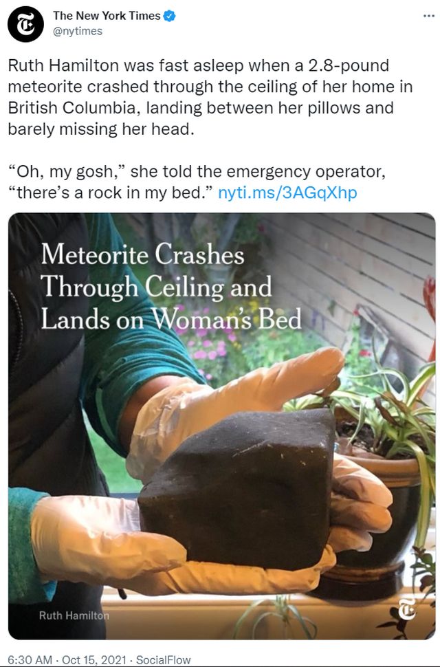 Τότε η γυναίκα συνειδητοποίησε ότι το αντικείμενο στο μαξιλάρι της –ένας γκριζωπός ογκόλιθος μεγέθους πεπονιού– ήταν πιθανότατα ένα κομμάτι μετεωρίτη.