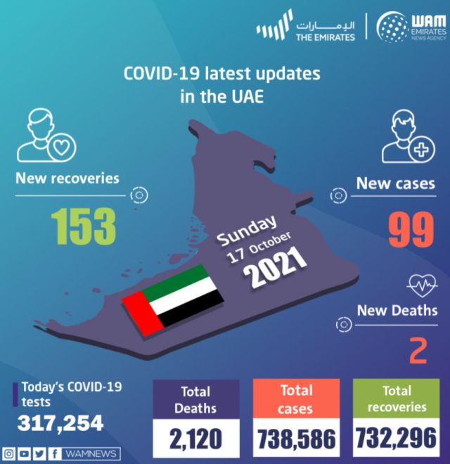 Τα Ηνωμένα Αραβικά Εμιράτα ανακοίνωσαν την Κυριακή δύο (2) νέους θανάτους από κορωνοϊό και 99 κρούσματα.