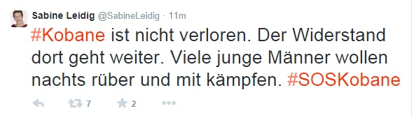 Εν τω μεταξύ, μια πολύ σημαντική καταγγελία Γερμανίδας που βρίσκεται στην περιοχή, αναφέρει στο twitter ότι φάλαγγα με οχήματα του Ισλαμικού Κράτους πέρασαν από την Τουρκία στη Συρία. Με τις “ευλογίες” της τουρκικής κυβέρνησης φυσικά.