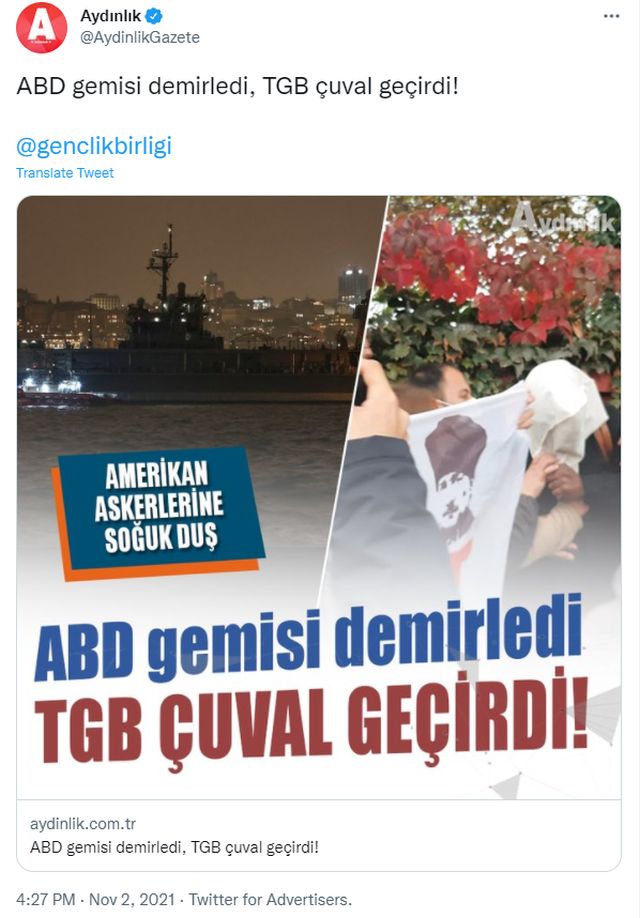Τούρκοι εθνικιστές ανακοίνωσαν ότι επιτέθηκαν σε Αμερικανούς, μέλη του πληρώματος του πολεμικού πλοίου «USS Mount Whitney», όταν αυτό αγκυροβόλησε στο λιμάνι Σαράιμπουρνού της Κωνσταντινούπολης.