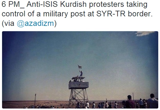 Κούρδοι διαδηλωτές που από το βράδυ της Δευτέρας έχουν κινητοποιηθεί σε ολόκληρη την Τουρκία διαμαρτυρόμενοι ενάντια στο Ισλαμικό Κράτος και στην τουρκική κυβέρνηση που το στηρίζει, το εξοπλίζει και το τροφοδοτεί, κατέλαβαν φυλάκιο του τουρκικού στρατού στα σύνορα με τη Συρία.