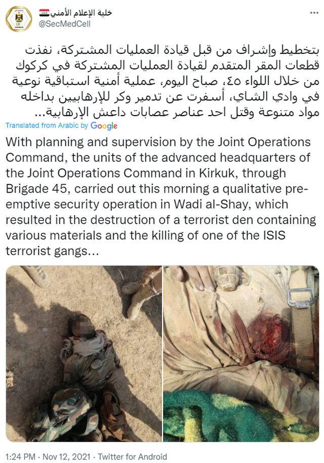 Το γραφείο Τύπου της ιρακινής Ασφάλειας επιβεβαίωσε επίσης ότι δύο ακόμα τζιχαντιστές του Ισλαμικού Κράτους τραυματίστηκαν κατά τη διάρκεια ένοπλης σύγκρουσης.