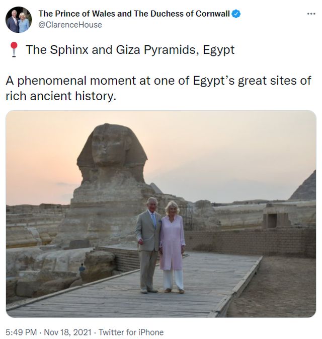 Την Πέμπτη, ο πρίγκιπας Κάρολος και η δούκισσα Καμίλα παρευρέθηκαν σε μία δεξίωση στις Πυραμίδες της Γκίζας.