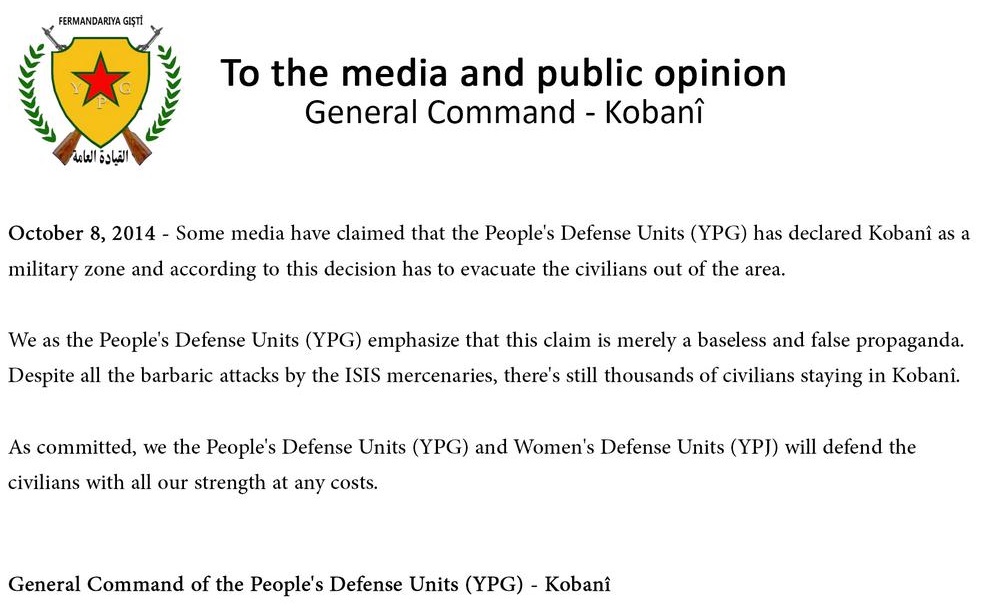 “Ορισμένα Μέσα υποστήριξαν ότι το YPG κήρυξε την Κομπάνι στρατιωτική ζώνη και σύμφωνα με αυτή την απόφαση κηρύχθηκε η εκκένωση της περιοχής από τους αμάχους. Εμείς, το YPG, υπογραμμίζουμε ότι αυτός ο ισχυρισμός είναι αβάσιμος και ψεύτικη προπαγάνδα. Παρά τις βαρβαρικές επιθέσεις που δεχόμαστε από τους μισθοφόρους του Ισλαμικού Κράτους, ακόμα παραμένουν χιλιάδες πολίτες στην Κομπάνι. Όπως έχουμε δηλώσει, εμείς το YPG, θα υπερασπιστούμε την πόλη θα υπερασπιστούμε τους αμάχους με όλες μας τις δυνάμεις και με κάθε κόστος”.