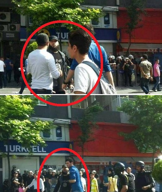 Όπως βλέπετε μπροστά ακριβώς από τις διμοιρίες των τουρκικών ΜΑΤ που φυλάνε τράπεζα, για να μην της επιτεθούν Κούρδοι διαδηλωτές, άντρες με μαύρα μπλουζάκια με το σήμα του Ισλαμικού Κράτους κάνουν τις “συνεννοήσεις” πώς θα χτυπηθεί η διαδήλωση με άνδρες της τουρκικής ασφάλειας (φοράνε πολιτικά και μαύρα κράνη).