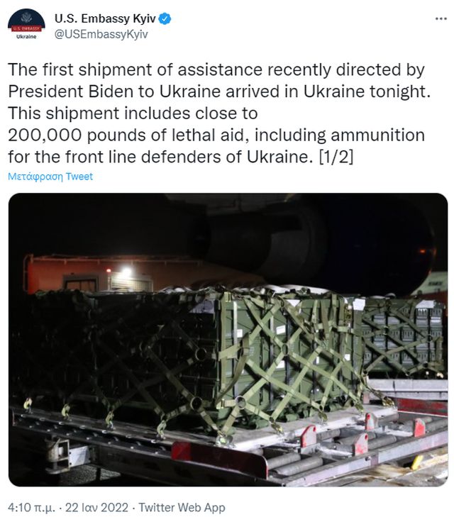 Σύμφωνα με την αμερικανική πρεσβεία, το βράδυ της Παρασκευή ξεκίνησε να φτάνει αμερικανική στρατιωτική βοήθεια για να βοηθήσει την Ουκρανία να αμυνθεί έναντι πιθανής εισβολής από τη Ρωσία.