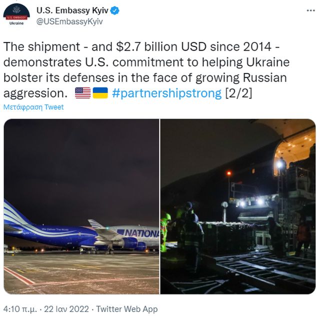 «Η αποστολή – και 2,7 δισ. δολάρια από το 2014 – καταδεικνύει τη δέσμευση των ΗΠΑ να βοηθήσουν την Ουκρανία να ενισχύσει την άμυνά της ενόψει της αυξανόμενης ρωσικής επιθετικότητας», ανέφερε η πρεσβεία σε άλλο tweet της.