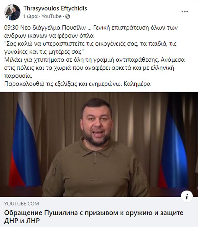 Ο γνωστός γεωοικονομικός αναλυτής Θρασύβουλος Ευτυχίδης, σε ανάρτησή του στο Facebook, αναμεταδίδει για «χτυπήματα» στη γραμμή αντιπαράθεσης μεταξύ φιλορώσων και Ουκρανών στην Ανατολική Ουκρανία, σε περιοχές με ελληνικό πληθυσμό: