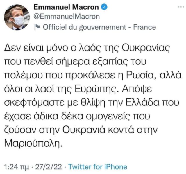 Ειδικότερα, στην ανάρτηση που έκανε στα ελληνικά, ο πρόεδρος της Γαλλίας αναφέρει: