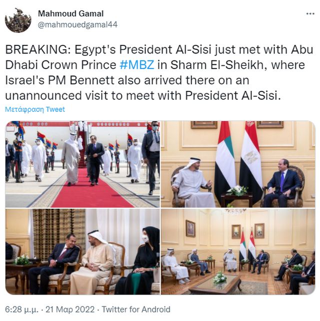 Ο πρωθυπουργός του Ισραήλ, Ναφτάλι Μπένετ, πραγματοποίησε μια αιφνιδιαστική επίσκεψη στο Σαρμ Ελ Σέιχ για να συναντηθεί με τον Αιγύπτιο πρόεδρο Άμπντελ Φάταχ αλ Σίσι και τον διάδοχο του Άμπου Ντάμπι και ισχυρό άνδρα των Ηνωμένων Αραβικών Εμιράτων, Μοχάμεντ Μπιν Ζαγιέντ Αλ Ναχιάν τη Δευτέρα.