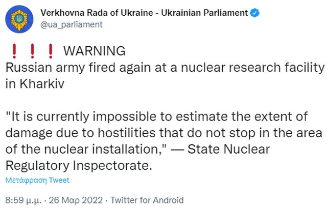 «Αυτή τη στιγμή είναι αδύνατο να εκτιμηθεί το εύρος των ζημιών λόγω των εχθροπραξιών που δεν σταματούν στην περιοχή της πυρηνικής εγκατάστασης», λέει η ανάρτηση, που επικαλείται την κρατική ρυθμιστική αρχή επιθεώρησης των πυρηνικών.