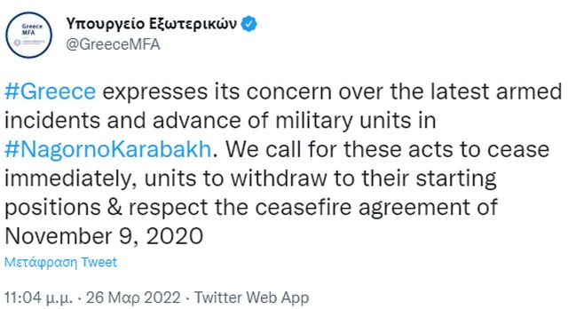 Η Ελλάδα, με ανάρτηση του υπουργείου Εξωτερικών στο Twitter, εκφράζει την ανησυχία της για τα τελευταία ένοπλα επεισόδια και την προώθηση στρατιωτικών μονάδων στο Ναγκόρνο Καραμπάχ.