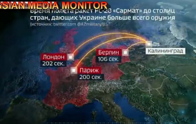 Προσομοίωση πυρηνικής επίθεσης έκανε δημοφιλής εκπομπή της ρωσικής, κατά την διάρκεια της οποία προβλήθηκε γράφημα σύμφωνα με το οποίο ένας πυραυλος που θα εκτοξευθεί από το Καλίνινγκραντ, στη Βαλτική Θάλασσα, θα έχει φτάσει σε 106 δευτερόλεπτα στο Βερολίνο, σε 200 δευτερόλεπτα στο Παρίσι και σε 202 δευτερόλεπτα στο Λονδίνο!