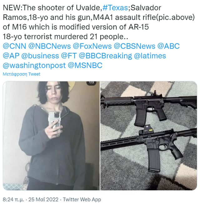 Ο Δημοκρατικός γερουσιαστής της Πολιτείας του Τέξας, Ρόλαντ Γκουτιέρεζ, είπε σε συνέντευξη στο MSNBC ότι ο δράστης είχε αγοράσει τα όπλα του νόμιμα στα 18α γενέθλιά του.