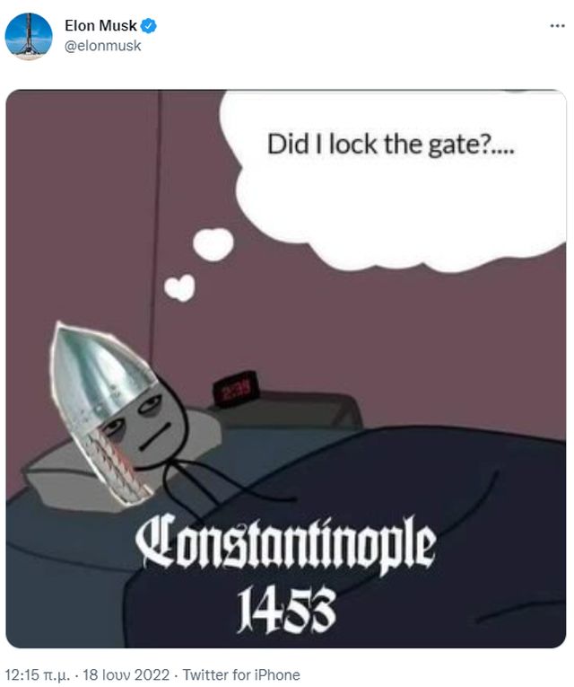 Ο Διευθύνων Σύμβουλος της Tesla και της SpaceX, Έλον Μασκ, ανέβασε στον λογαριασμό του στο Twitter μία χιουμοριστική φωτογραφία με την φιγούρα του «stickman» στην οποία απεικονίζεται ως ένας Βυζαντινός στρατιώτης με το κράνος του, που ξυπνάει στον ύπνο και προσπαθεί να θυμηθεί αν κλείδωσε την Κερκόπορτα, από την οποία εισήλθαν και κατέλαβαν την Κωνσταντινούπολη οι Τούρκοι τον Μάιο του 1453.