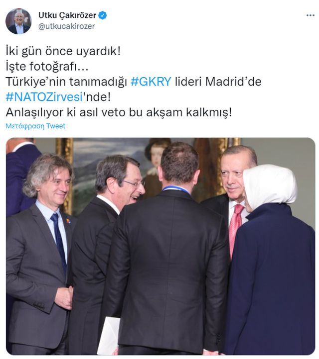 Την συνομιλία του Ταγίπ Ερντογάν με τον προέδρο της Κύπρου Νίκο Αναστασιάδη στη Σύνοδο του ΝΑΤΟ στη Μαδρίτη επέκρινε με δριμύτητα ο βουλευτής της αξιωματικής αντιπολίτευσης (Ρεπουπλικανικό Λαϊκό Κόμμα – CHP) Ουτκού Τσακίροζερ.