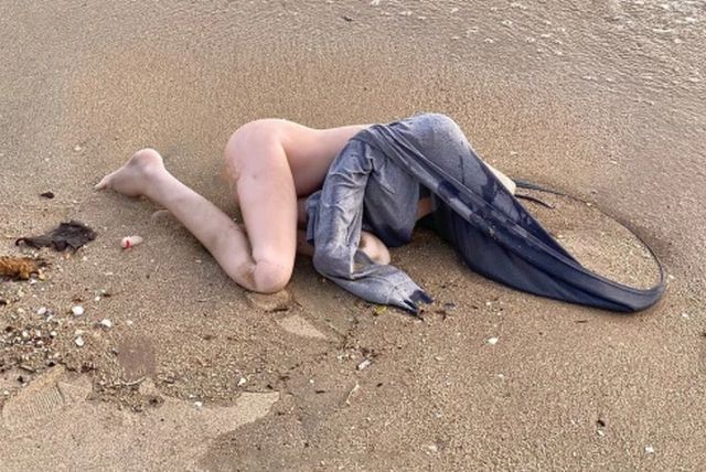 Φωτογραφίες δείχνουν αυτό που φαίνεται να είναι ένα γυμνό σώμα, με ένα ακάλυπτο πόδι, ξαπλωμένο στην αμμουδιά με ένα γκρι φόρεμα που καλύπτει το πάνω μισό του σώματος.