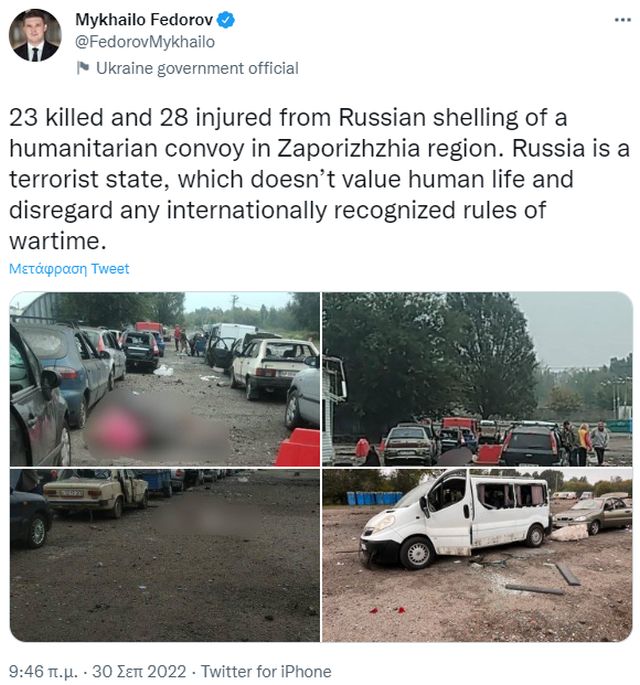 Μια οχηματοπομπή που μετέφερε Ουκρανούς πολίτες επλήγη το πρωί της Παρασκευής από ρωσικό πύραυλο κοντά στην πόλη Ζαπορίζια, της νότιας Ουκρανίας, όπως δήλωσε ο κυβερνήτης της. Σύμφωνα με τον ίδιο, υπάρχουν τουλάχιστον 23 νεκροί και 28 τραυματίες.