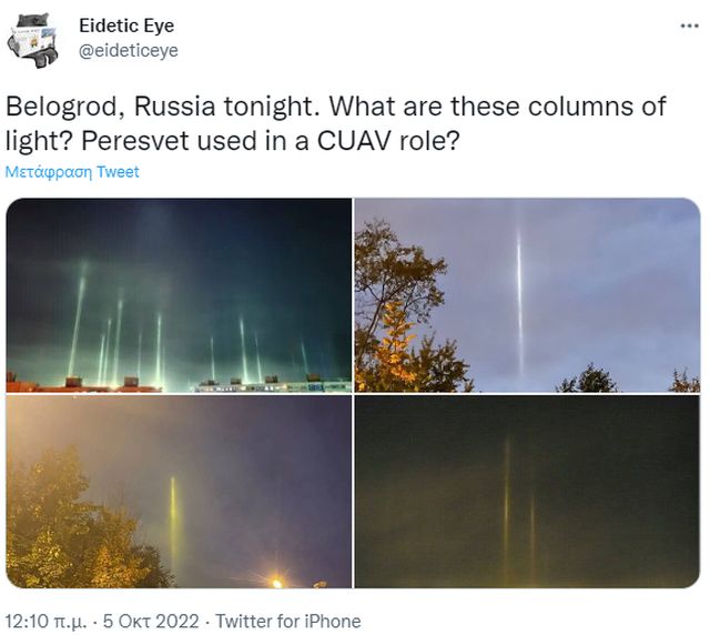 Το βράδυ της 4ης Οκτωβρίου, κάτοικοι του Μπέλγκοροντ, στα σύνορα της Ρωσίας με την Ουκρανία, ξαφνιάστηκαν όταν είδαν λευκοκίτρινες φωτεινές στήλες (φωτογραφία, επάνω, από το Twitter) να εμφανίζονται στον ουρανό, γράφει η ρωσική ιστοσελίδα life.