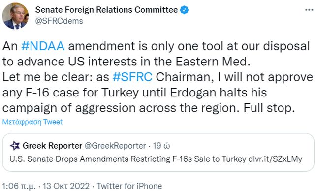 »Επιτρέψτε μου να είμαι ξεκάθαρος: ως Πρόεδρος της Επιτροπής Διεθνών Σχέσεων της Γερουσίας, δεν θα εγκρίνω καμία πώληση F-16 στην Τουρκία έως ότου ο Ερντογάν σταματήσει την επιθετική εκστρατεία του σε ολόκληρη την περιοχή. Τελεία και παύλα».