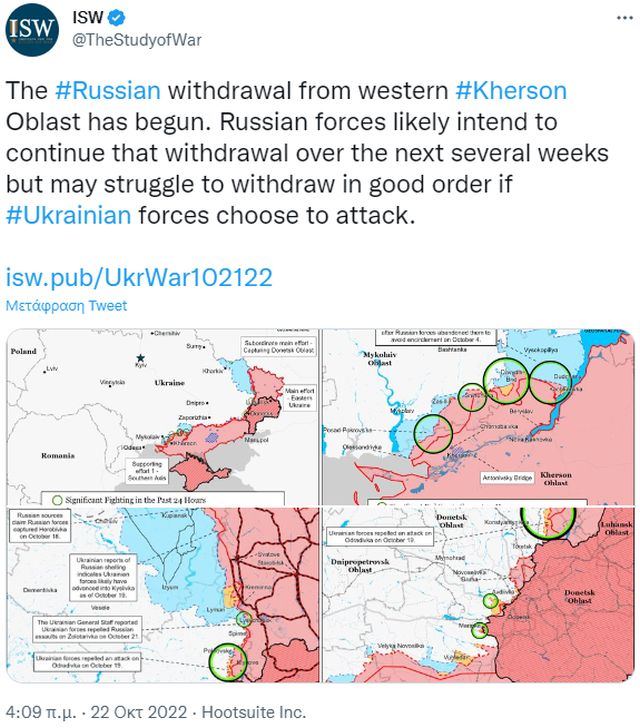 Τις τελευταίες μέρες αρκετοί αναλυτές καταλήγουν στο ίδιο συμπέρασμα, ότι έρχεται υποχώρηση των ρωσικών δυνάμεων στη Χερσώνα.