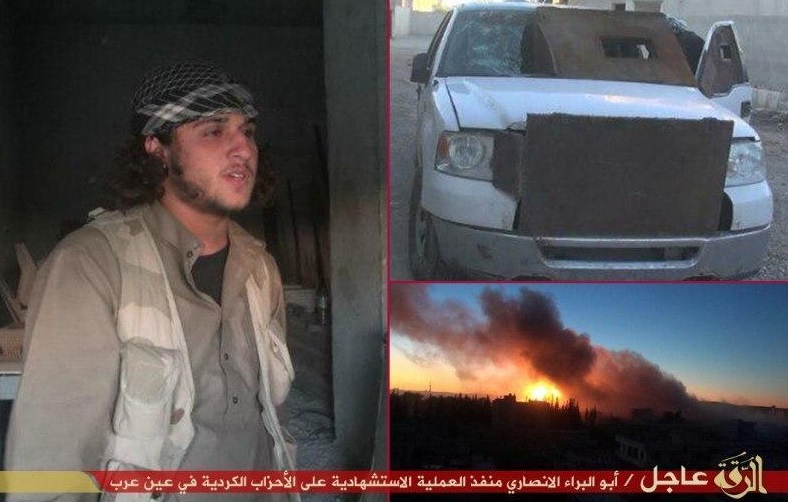 Στην κάτω φωτογραφία το Ισλαμικό Κράτος επιδεικνύει με υπερηφάνεια το φορτηγό – βόμβα που έφτιαξε για να επιτεθεί στους Κούρδους υπερασπιστές της Κομπάνι τη Δευτέρα.