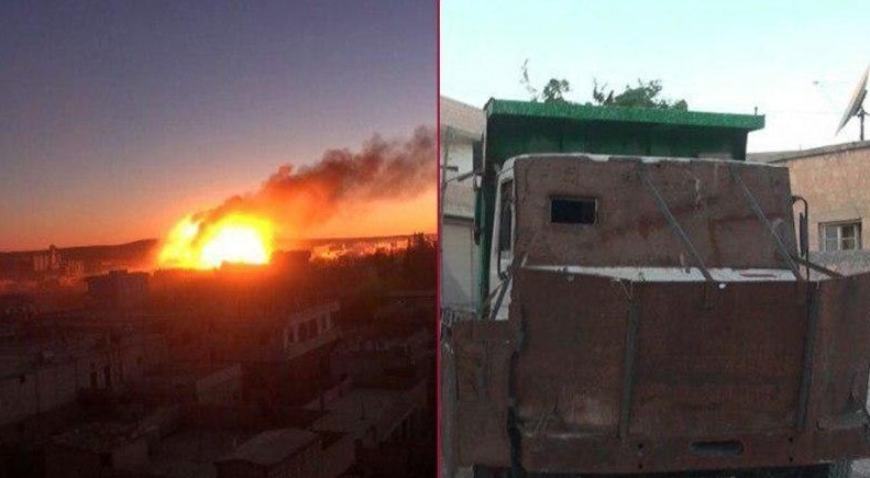 Μεταξύ των φωτογραφιών που έχει “ρίξει” στα social media είναι και οι ακόλουθες φωτογραφίες με τα οχήματα – βόμβες που οδηγούν οι βομβιστές αυτοκτονίας πάνω στις θέσεις των αντιπάλων τους και ανατινάζονται μαζί τους.