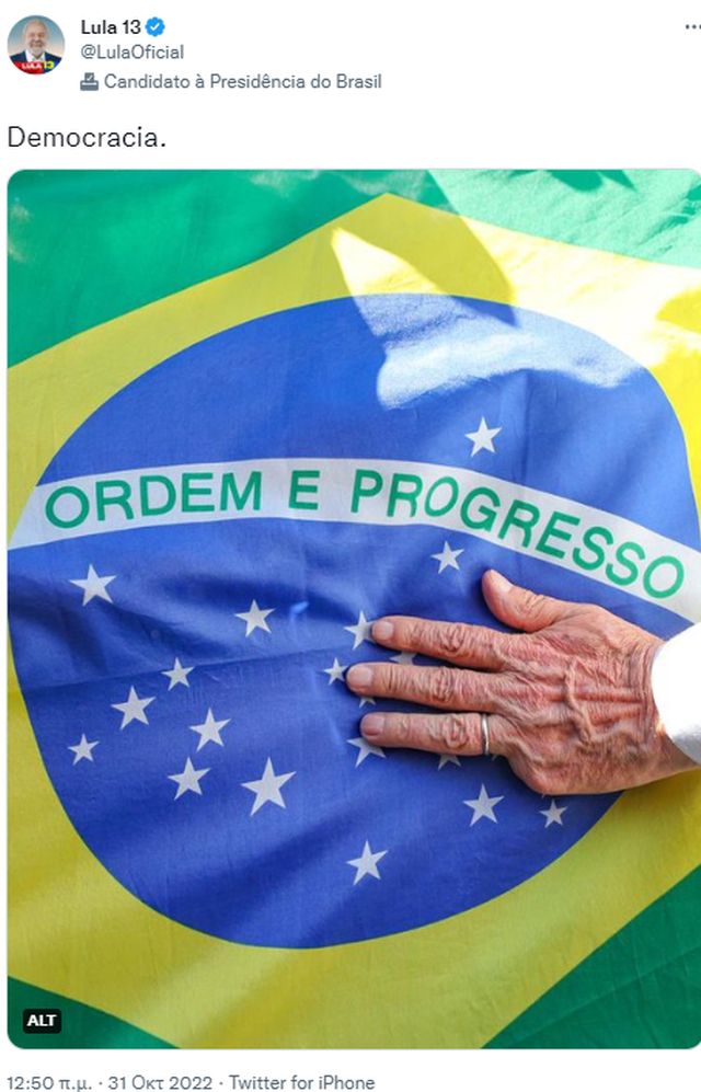 Μετά τη νίκη του ο Λούλα ντα Σίλβα ανέβασε στο Twitter μία φωτογραφία με τη σημαία της Βραζιλίας και πάνω της το χέρι του, ενώ έγραψε και τη λέξη: «Δημοκρατία».