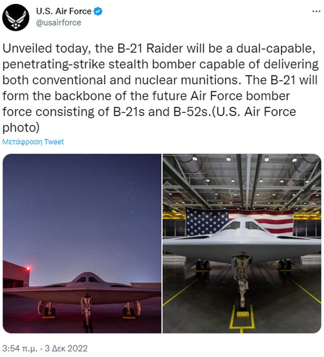 Με κάθε επισημότητα η Πολεμική Αεροπορία των ΗΠΑ παρουσίασε το Β-21 Raider, το νέο της πυρηνικό βομβαρδιστικό τεχνολογίας stealth, το οποίο χαρακτηρίζeται ως «το πιο προηγμένο στρατιωτικό αεροσκάφος που φτιάχτηκε ποτέ».