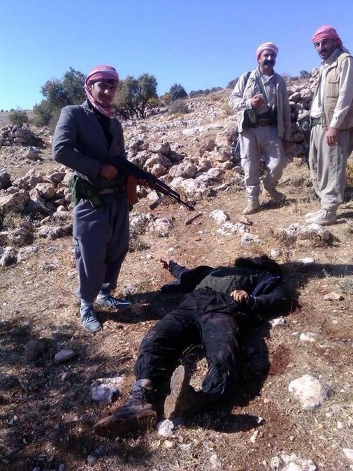 Υπερήφανοι ποζάρουν πάνω από το πτώμα ενός νεκρού τζιχαντιστή. Προφανώς κάποιου από τους πολλούς που σκόπευε να αποκεφαλίσει άνδρες, να διακορεύσει παρθένες, να πάρει τις γυναίκες αιχμάλωτες να τις πουλήσει στα σκλαβοπάζαρα…