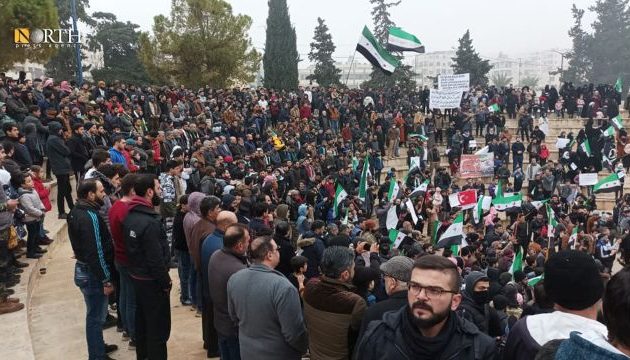 Μια αποκλειστική πηγή είπε στην ιστοσελίδα North Press ότι εκατοντάδες διαδήλωσαν κρατώντας πανό που απέρριπταν τις εκκλήσεις της Τουρκίας για συμφιλίωση με τη συριακή κυβέρνηση.