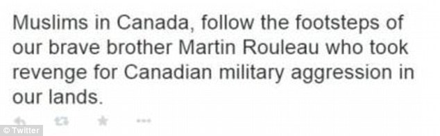 “Οι μουσουλμάνοι στον Καναδά ακολουθούν τα βήματα του γενναίου αδελφού μας Μάρτιν Ρουλό, ο οποίος πήρε εκδίκηση για την καναδική στρατιωτική επέμβαση στα εδάφη μας”, ήταν ένα από τα πολλά που έγραψε μέχρι να καταργηθεί ο λογαριασμός του.