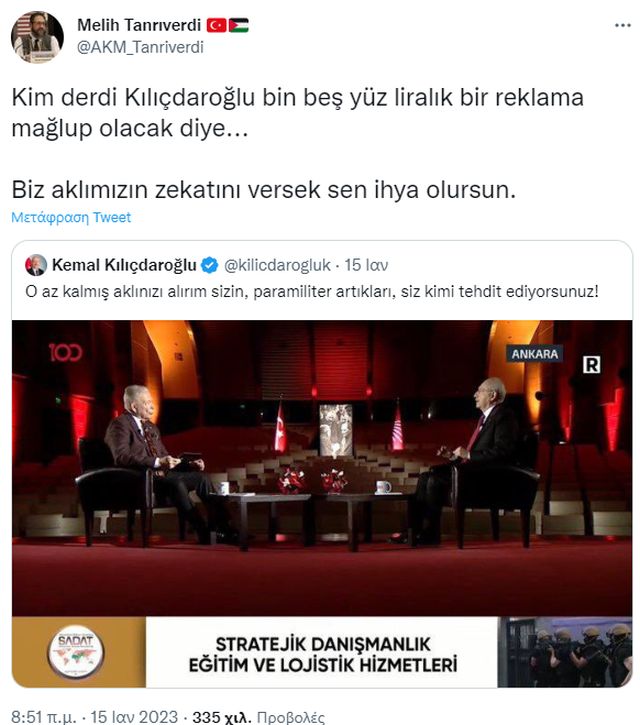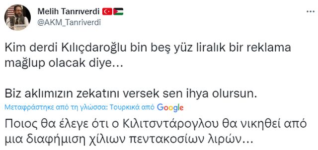 Μετά τη διαφήμιση, ο Κιλιτσντάρογλου έγραψε σε tweet ότι: