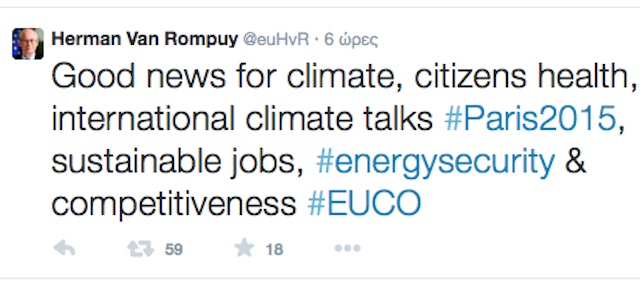 “Καλή είδηση για το κλίμα, την υγεία των πολιτών, τις διεθνείς συνομιλίες για το κλίμα (που θα γίνουν το 2015 στο Παρίσι) για τις βιώσιμες θέσεις εργασίας, την ενεργειακή ασφάλεια και την ανταγωνιστικότητα”
