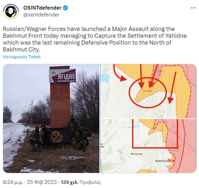 «Στις 19.00 της 25ης Φεβρουαρίου, οι μονάδες επίθεσης της Wagner πήραν τον πλήρη έλεγχο του χωριού Γιαγκίντνε, βόρεια της Μπαχμούτ».