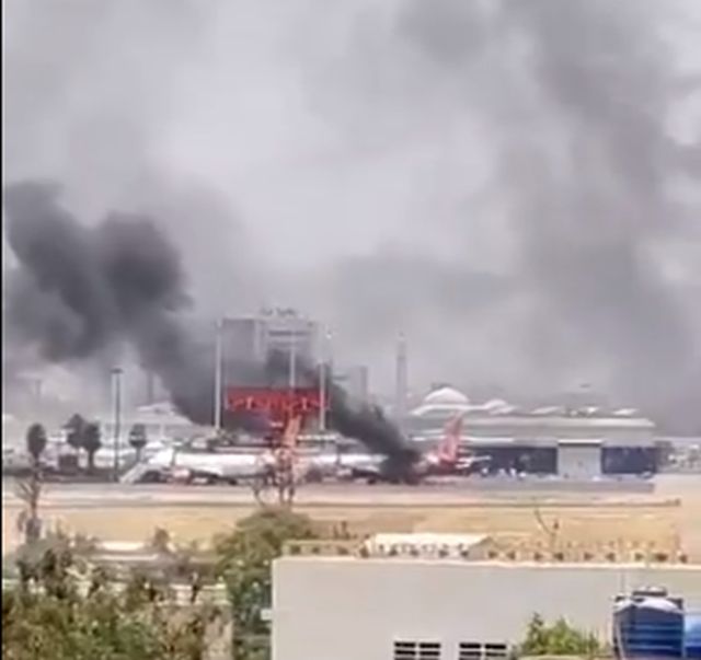 Πυκνοί καπνοί από το υπουργείο Εθνικής Άμυνας (πάνω), η ίδια κατάσταση και στο αεροδρόμιο του Χαρτούμ (κάτω).