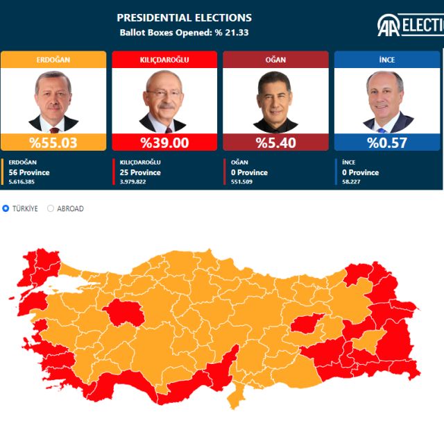 Το κρατικό πρακτορείο ειδήσεων Anadolu δίνει με βάση το 21,33% της ενσωμάτωσης, τον Ερντογάν να βρίσκεται στο 55,03% και τον Κιλιτσντάρογλου στο 39%.