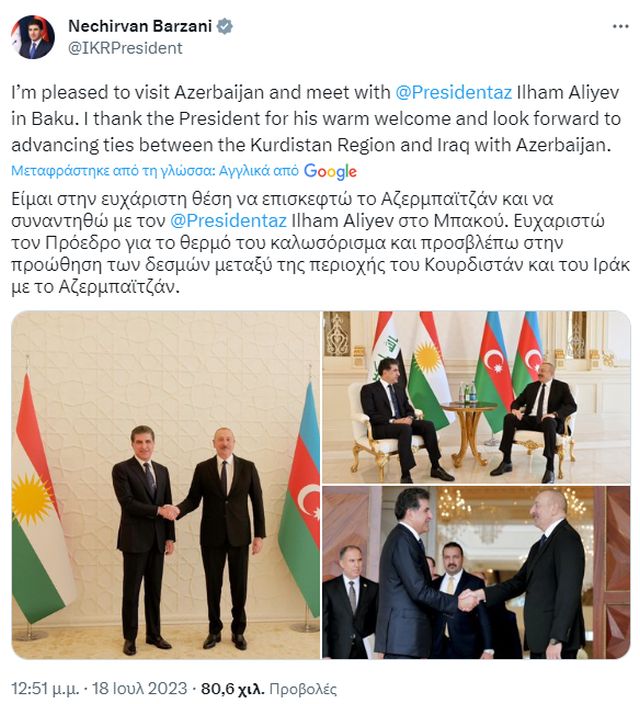 Ο πρόεδρος του ιρακινού Κουρδιστάν Νετσιρβάν Μπαρζανί συναντήθηκε την Τρίτη 18/7 με τον ομόλογό του από το Αζερμπαϊτζάν, Ιλχάμ Αλίεφ στο Μπακού, για να υπογραμμίσει την αμοιβαία επιθυμία για ενίσχυση των διμερών σχέσεων, μεταξύ άλλων με το άνοιγμα Γενικού Προξενείου του Αζερμπαϊτζάν στην κουρδική πρωτεύουσα Ερμπίλ.