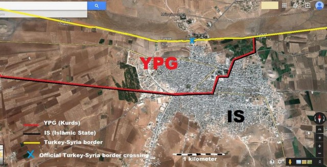 Όπως φαίνεται οι Κούρδοι ελέγχουν όλη την δυτική πλευρά της πόλης μαζί με την μεθόριο ενώ οι τζιχαντιστές ελέγχουν την ανατολική πόλη και το κέντρο.