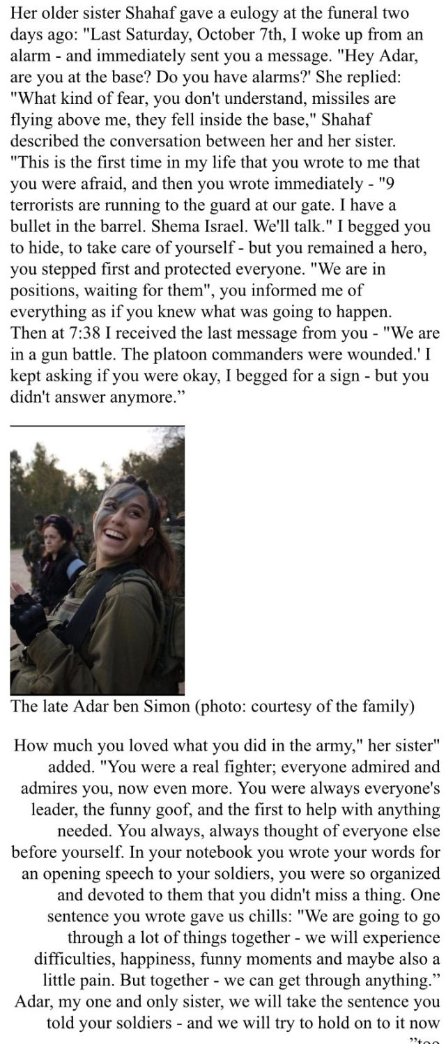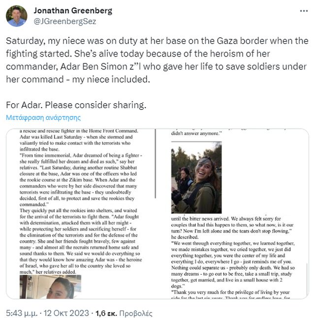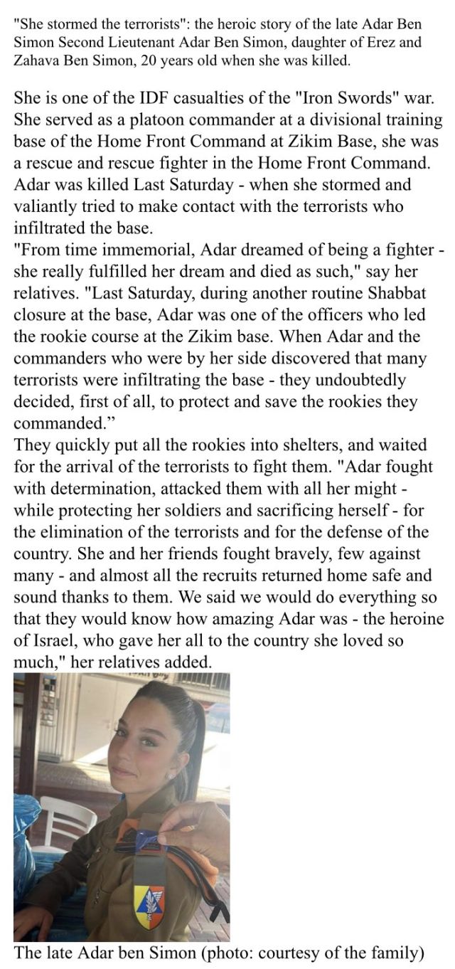 Ήταν Σάββατο 07/10, όταν η τζιχαντιστική Χαμάς ξεκίνησε την επίθεσή της προς το Ισραήλ. Ο ισραηλινός στρατός ετοιμάστηκε γρήγορα για να υπερασπιστεί τον λαό του, με την 20χρονη ανθυπολοχαγό Αντάρ Μπεν Σιμόν (Adar Ben Simon), 20 ετών, από το Neve Ziv, διοικητή διμοιρίας στη Διοίκηση Εσωτερικού Μετώπου, να ρίχνεται κατευθείαν στη μάχη.