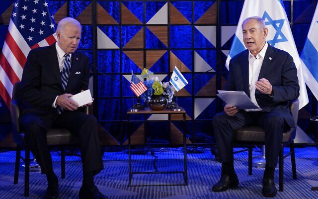 «Ήθελα να είμαι εδώ σήμερα», δήλωσε ο πρόεδρος των ΗΠΑ Τζο Μπάιντεν ξεκινώντας τις δηλώσεις του μαζί με τον Ισραηλινό πρόεδρο Μπενιαμίν Νετανιάχου από το Ισραήλ.