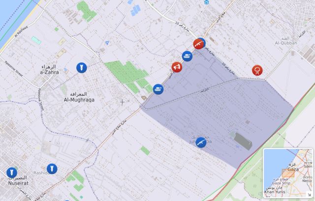 Με το έντονο μωβ χρώμα η ισραηλινή διείσδυση στην πόλη της Γάζας σύμφωνα με ορισμένες πληροφορίες.
