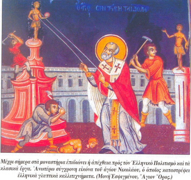 Η εικόνα παραπέμπει ευθέως στην εποχή της ύστερης αρχαιότητας, όταν οι πρώτοι χριστιανοί κατέστρεφαν ομοίως τον αρχαίο πολιτισμό εγκαινιάζοντας τον μεσαίωνα, που βύθισε την ανθρωπότητα στο σκοτάδι για περισσότερα από χίλια χρόνια.