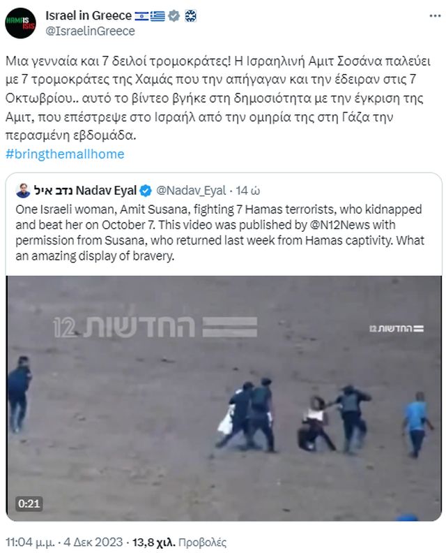 »Η Ισραηλινή Αμιτ Σοσάνα παλεύει με 7 τρομοκράτες της Χαμάς που την απήγαγαν και την έδειραν στις 7 Οκτωβρίου.. αυτό το βίντεο βγήκε στη δημοσιότητα με την έγκριση της Αμιτ, που επέστρεψε στο Ισραήλ από την ομηρία της στη Γάζα την περασμένη εβδομάδα».