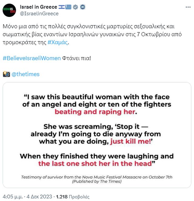 Η Ισραηλινή Πρεσβεία στην Αθήνα ανάρτησε στο «Χ», πρώην Twitter, μία φρικιαστική μαρτυρία ομαδικού βιασμού και δολοφονίας από τζιχαντιστές της Χαμάς μίας νεαρής Ισραηλινής που προηγουμένως διασκέδαζε στο ρέιβ πάρτι «Νόβα» στις 7 Οκτωβρίου 2023.